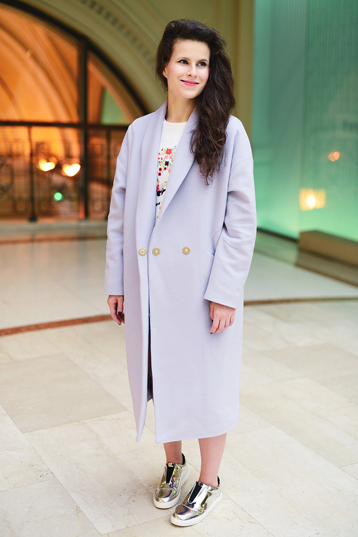 Здесь я сочетаю белую толстовку с радостным цветочным принтом с черными шортами из натуральной кожи (да-да, даже в таком демократичном бренде как Reserved можно найти подобную роскошь) и пальто цвета лаванды.